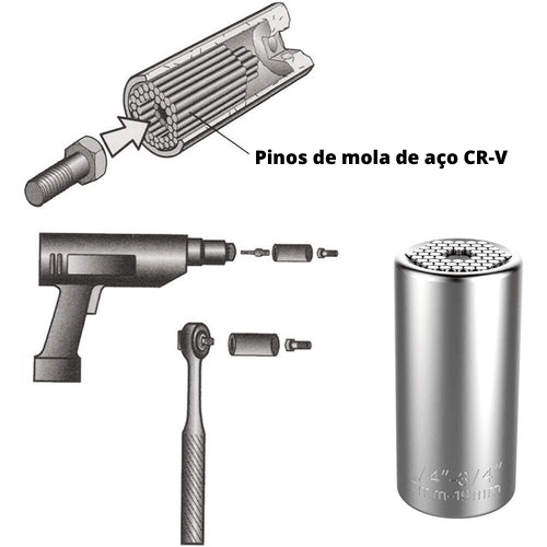 Através de sua versatilidade, essa chave pode se ajustar a maioria das métricas de 1/4 a 3/4, tais como: porcas de orelhas, porcas quebradas, porcas descascadas, parafusos de olhal, porcas quadradas, hexágonos, etc. Além disso, ela vem equipada com um adaptador para conectar-se à maioria das furadeiras elétricas, e chaves de catraca manuais.